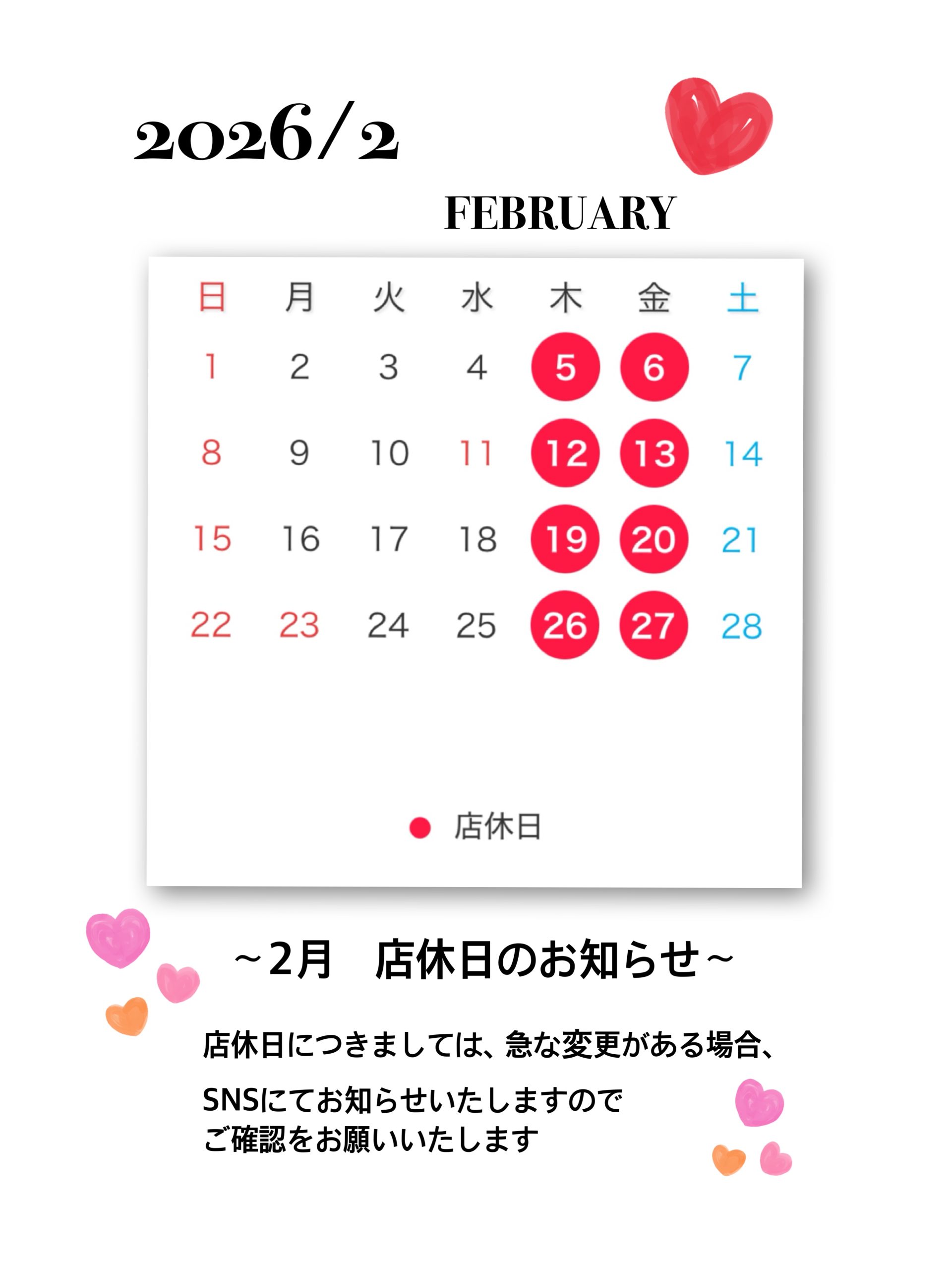 2月度 店休日のお知らせ 投稿日: 2024-12-282026-02-13 minami 2月度店休日のお知らせです、基本木曜、金曜のお休みとなります。!又、急なお休みの場合はSNSでお知らせいたします。