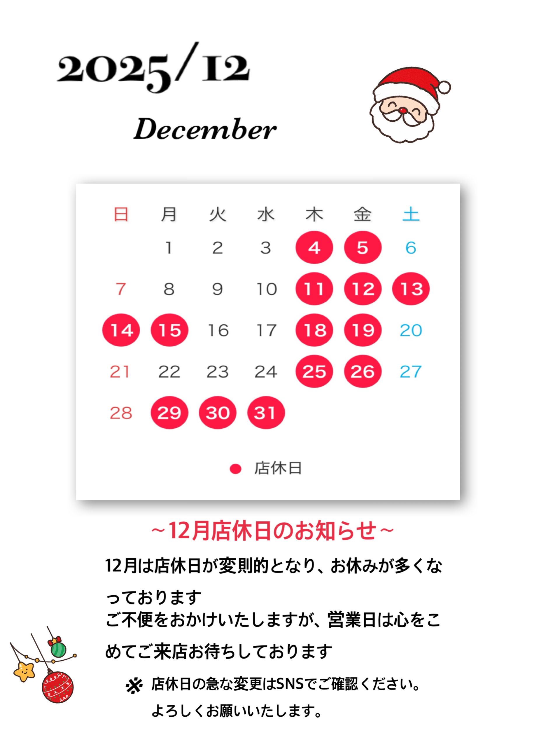 12月度 店休日のお知らせ 投稿日: 2024-12-282025-12-02 minami 12月度店休日のお知らせです、変則的なお休みとなりますのでご注意ください!年始営業はは2日から4日営業、5日から8日迄お休みとなります。又、急なお休みの場合はSNSでお知らせいたします。