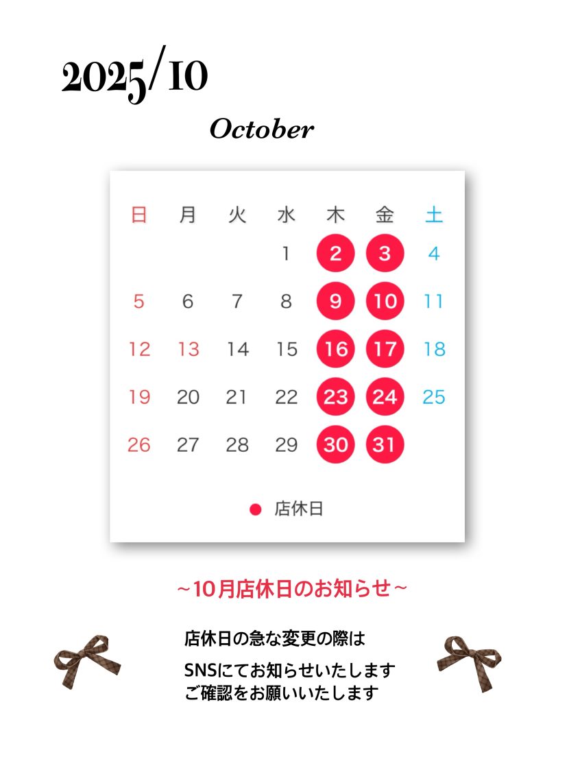 10月度は通常の木、金のお休みとなります。 又急なお休みの場合はSNSでお知らせいたします。
